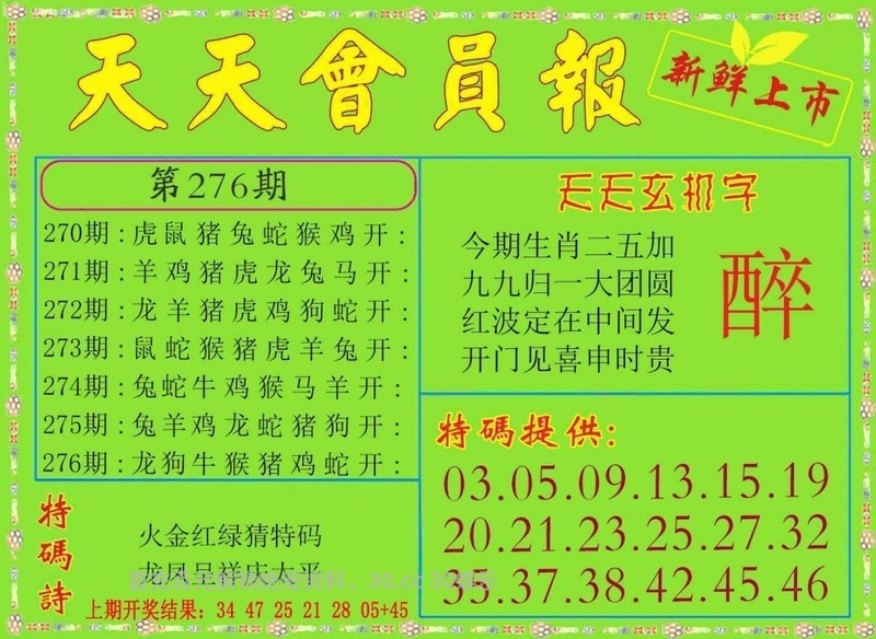 276期九码 | 13 35 06 09 26 19 28 15 44 | 开:鸡09 |